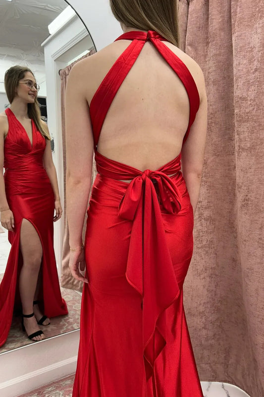 Beautiful Mermaid V Neck Sleeveless Satin Pleated Floor-Length Prom Dress
