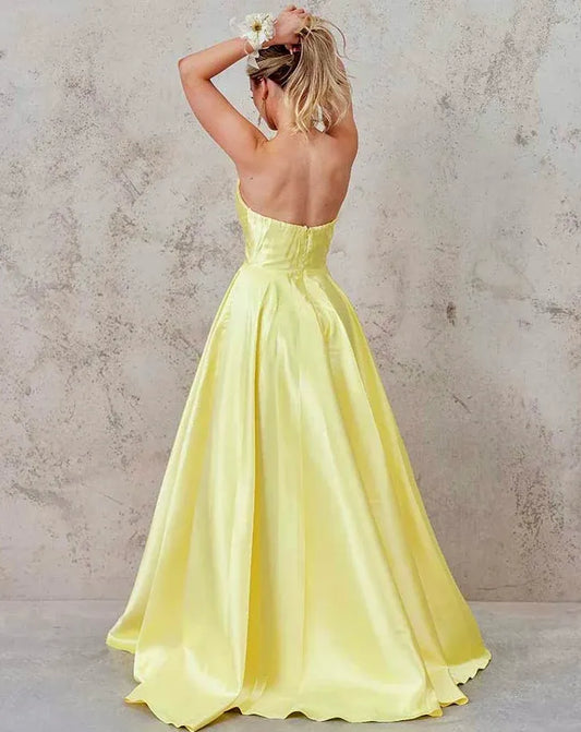 Luxury Strapless Sleeveless A-line Satin Pleated Floor-Length Prom Dress