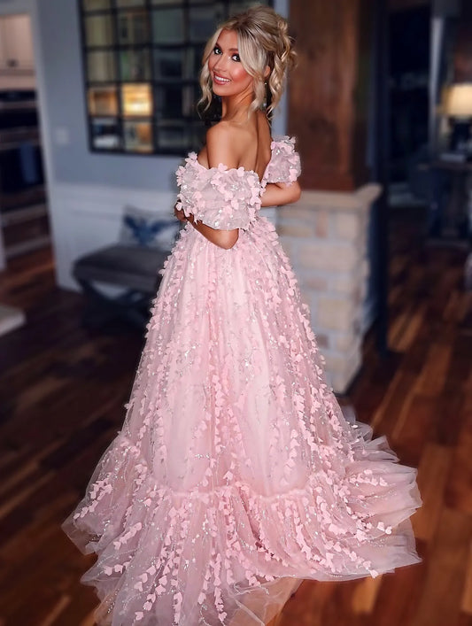 Exquisite Sweetheart Short Sleeve Ball Gown Flower Tulle Floor-Length Prom Dress