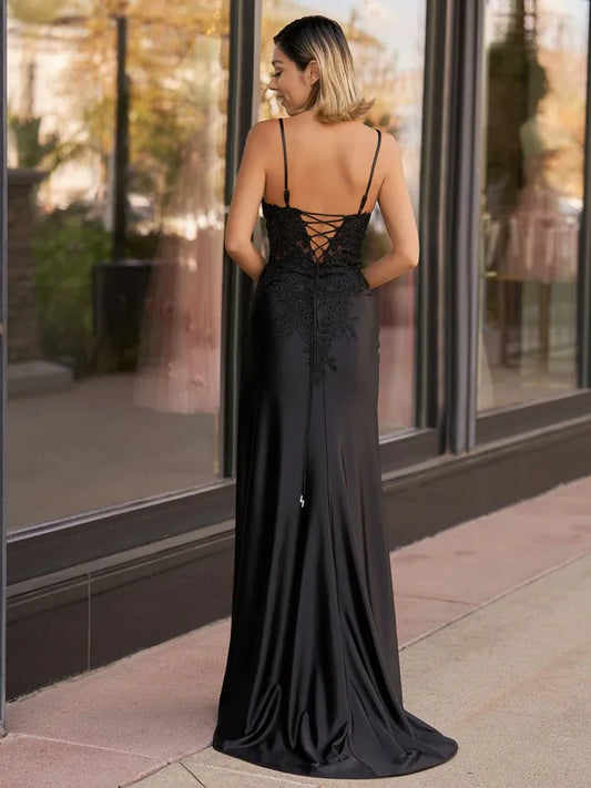 Affordable Fitted Spaghetti Straps Sleeveless Satin Slit Floor-Length Prom Dress