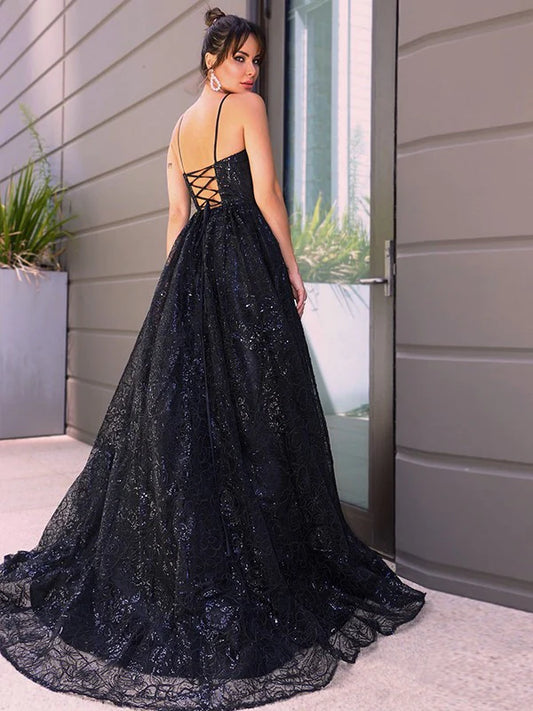 A-Line Princess V-neck Sequins Sleeveless Sequin Prom Dresses