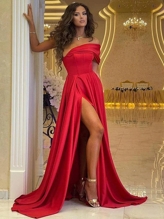 A-Line Princess Satin Ruffles Strapless Sleeveless Prom Dresses