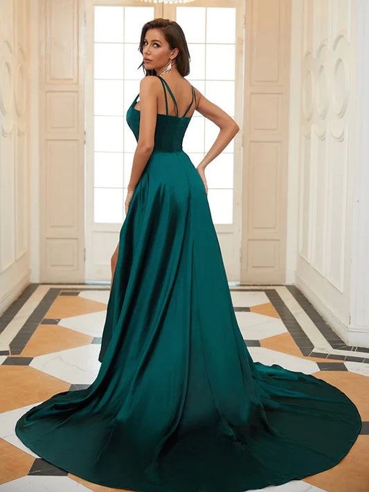 A-Line Princess Elastic Woven Satin Ruffles V-neck Sleeveless Court Train Prom Dresses