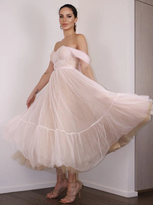 A-Line Princess Lace Ruched Off-the-Shoulder Sleeveless Tea-Length Homecoming Prom Dresses