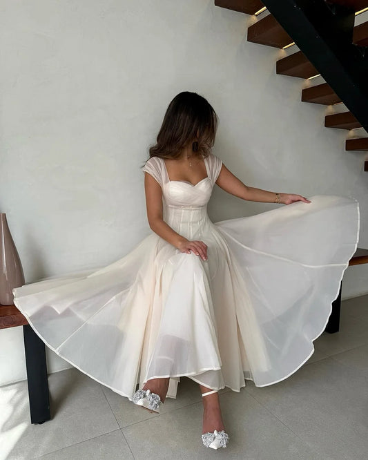 Elegant A-Line Sweetheart Cap Sleeve Lace Up Tea-Length Prom Dress