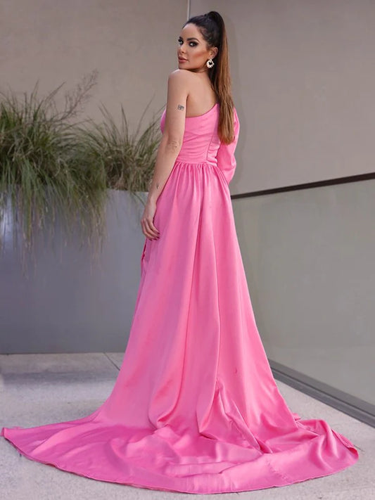 One-Shoulder Long Sleeves Ruched Charmeuse Prom Dresses