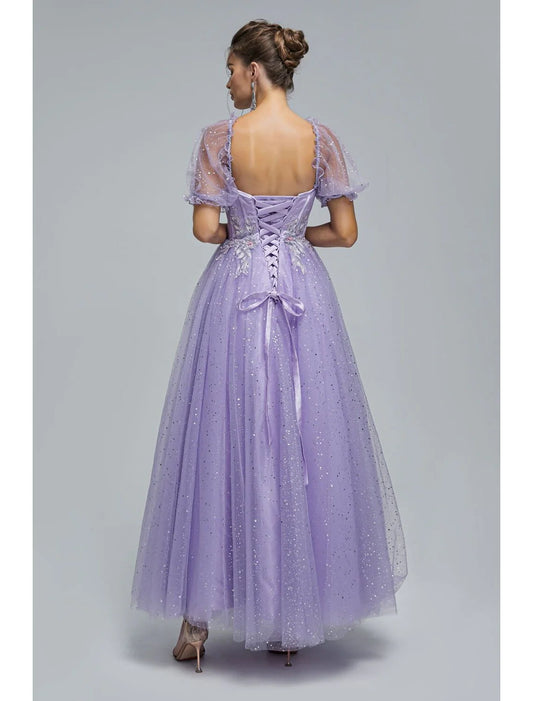 A-Line Prom Dresses Princess Dress Quinceanera Tea Length Short Sleeve Off Shoulder Tulle with Sequin Appliques