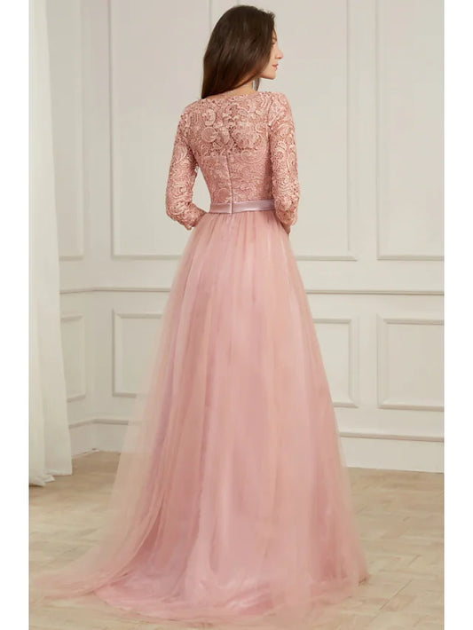 Evening Gown Elegant Dress Formal Long Sleeve Jewel Neck Lace with Beading Embroidery