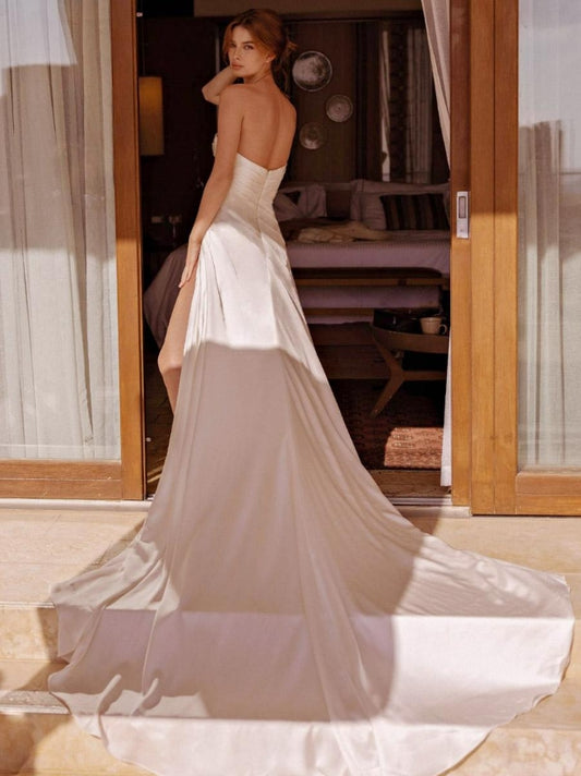 Simple Wedding Dress Satin Sweetheart Neck Sleeveless Split Front A-Line Bridal Dresses Court Train Dresses