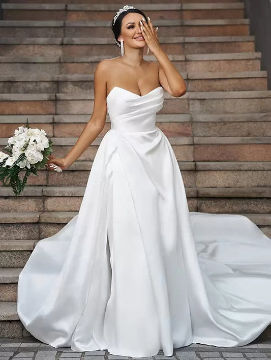 Wedding Dress Satin Strapless Sweetheart Neck Sleeveless A-Line Bridal Gowns Ballgown