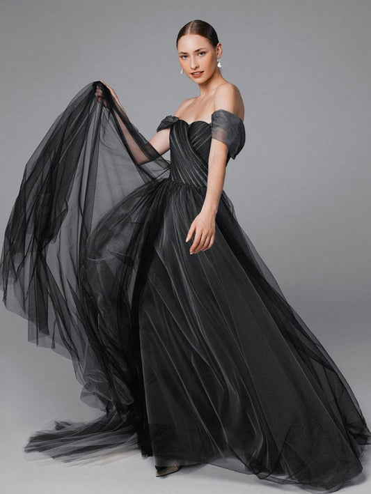 Gothic Black Wedding Dresses A-Line Strapless Sleeveless Backless With Train Lace Bridal Dress