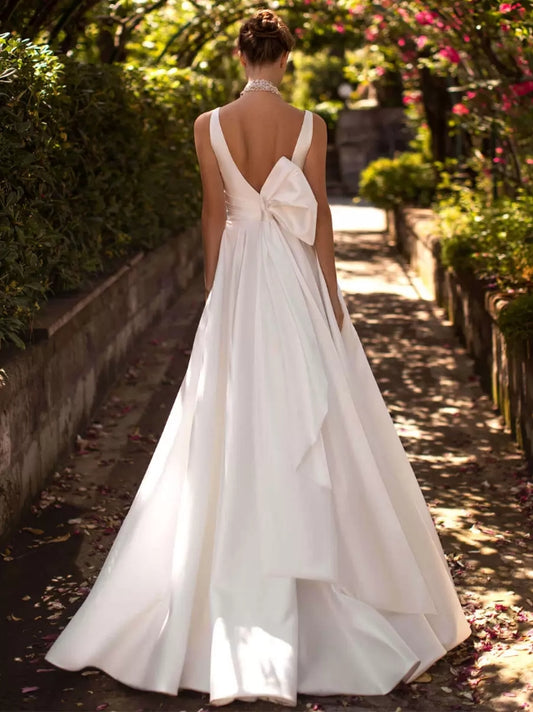 Vintage Wedding Dress V-Neck Sleeveless Natural Waist Satin With Train Bows Bridal Gowns