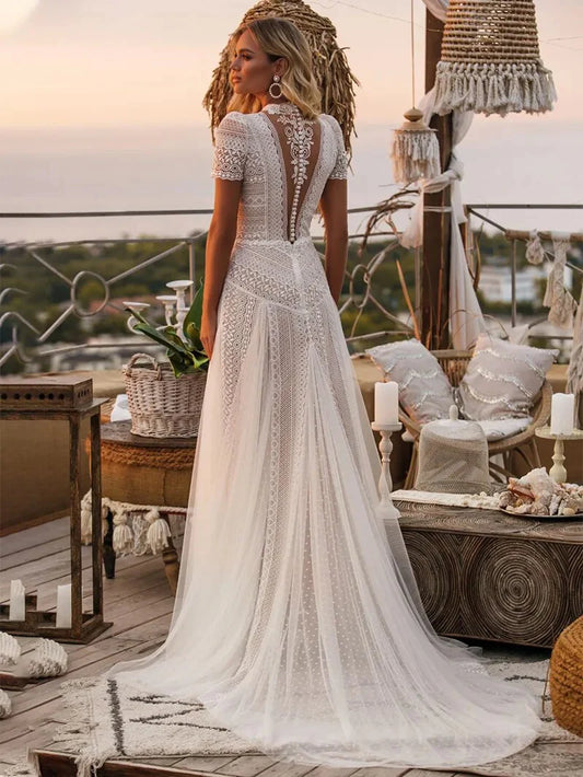 Beach Boho Wedding Dresses A-Line Illusion Neck Short Sleeve Court Train Lace Bridal Gowns With Appliques