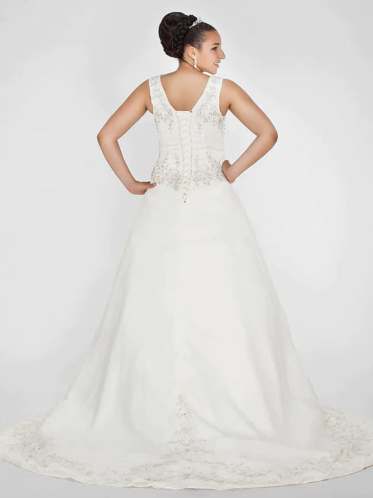Ball Gown Wedding Dresses V Neck Court Train Organza Beaded Lace Regular Straps Formal Plus Size with Beading Embroidery