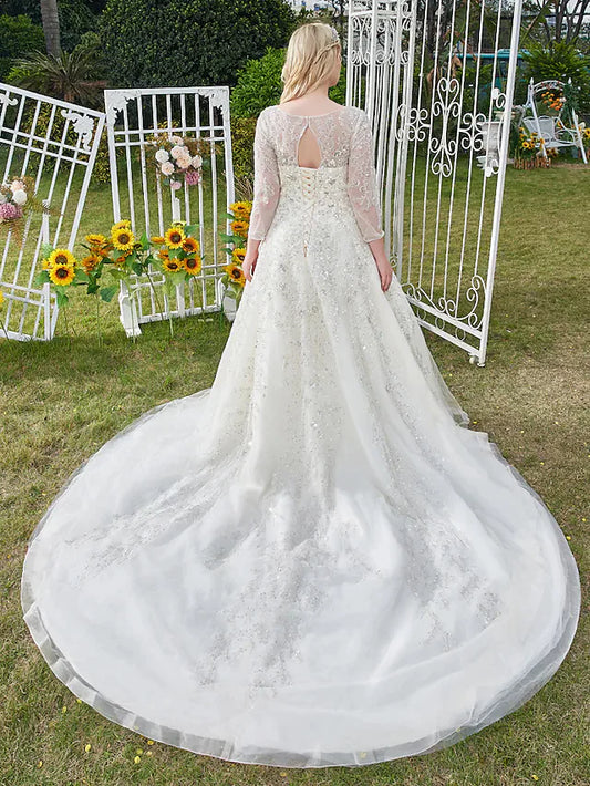 Princess Ball Gown Wedding Dresses Jewel Neck Cathedral Train Lace Tulle 3/4 Length Sleeve Formal Vintage Luxurious Sparkle & Shine Plus Size with Crystals Beading Appliques