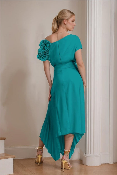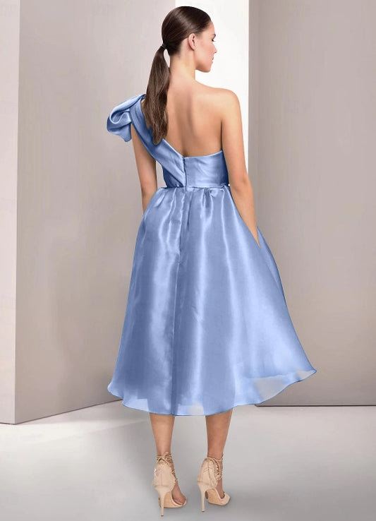A-Line Cocktail Dresses Ruched Wedding Guest Dress Tea Length Sleeveless One Shoulder Satin with Slit