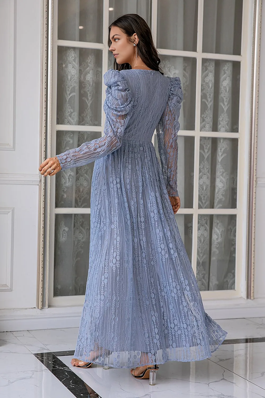 A-Line Blue Lace Long Prom Dress Wedding Guest Party Dresses with Sleeves
