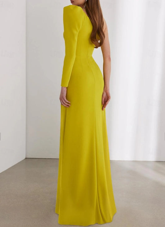 Column Ruched Wedding Guest Dresses Floor Length Long Sleeve One Shoulder Stretch Chiffon
