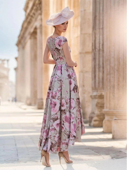 A-Line Wedding Guest Dress Floral Dress Vintage V Neck Satin Polyester Short Sleeve with Bow(s) Flower