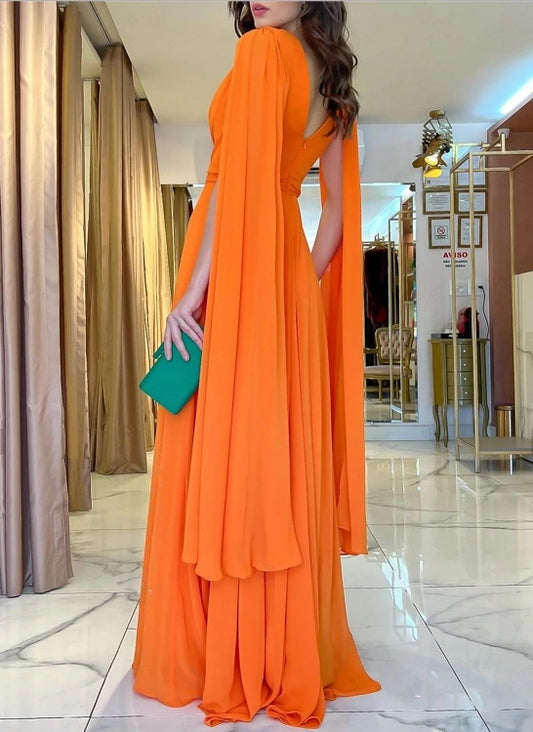 A-Line Wedding Guest Dresses Floor Length Long Sleeve V Neck Chiffon with Ruched