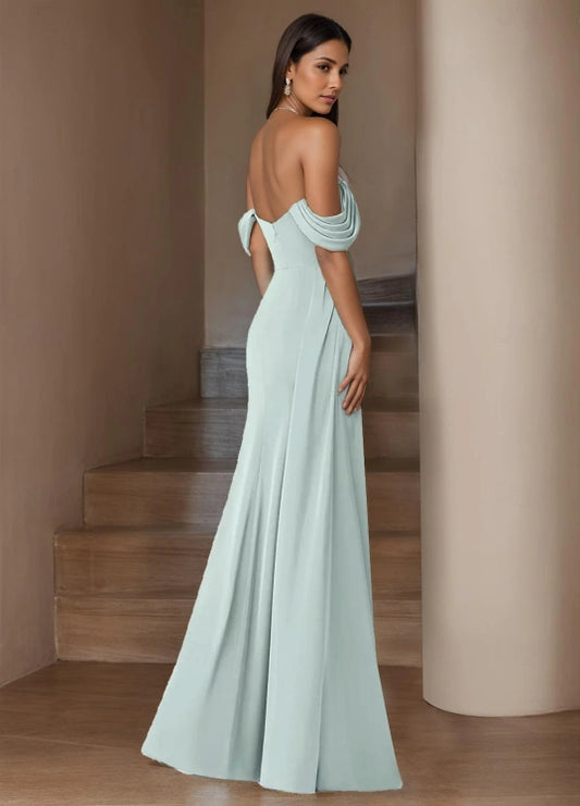 A-Line Wedding Guest Dresses Floor Length Sleeveless Off Shoulder Silk with Ruched Slit