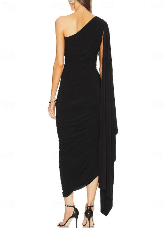 Column Black Wedding Guest Dresses Black Tie Ankle Length Sleeveless One Shoulder Spandex Backless with Ruched