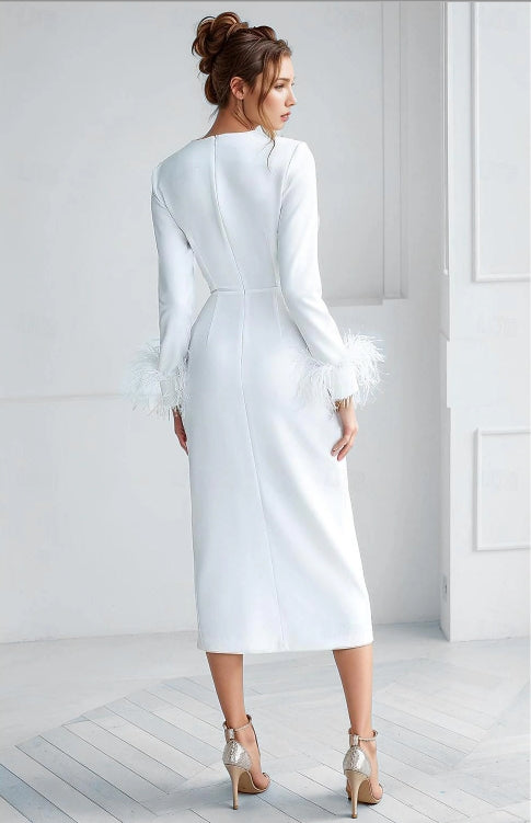 Sheath / Column Wedding Guest Dresses Formal Tea Length Jewel Neck with Feather