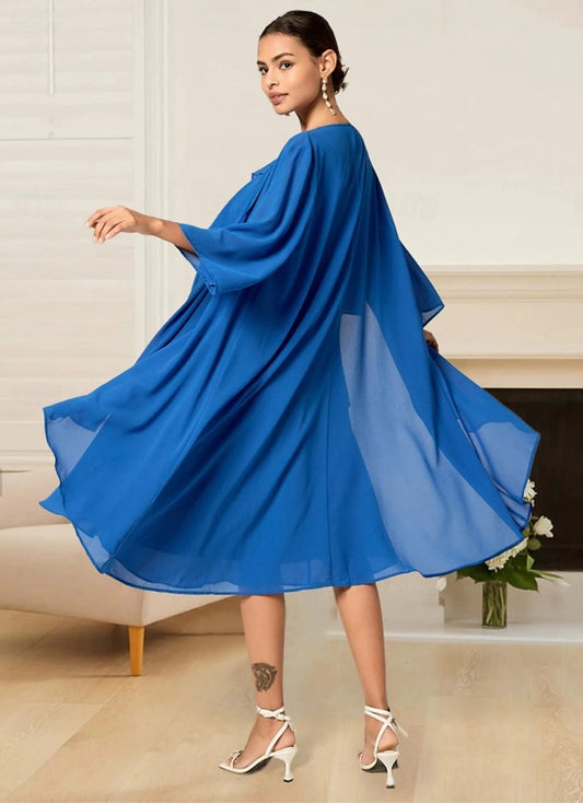 A Line Chiffon Tiered Party Wedding Guest Elegant Formal Crew Neck Long Sleeve Royal Blue Color
