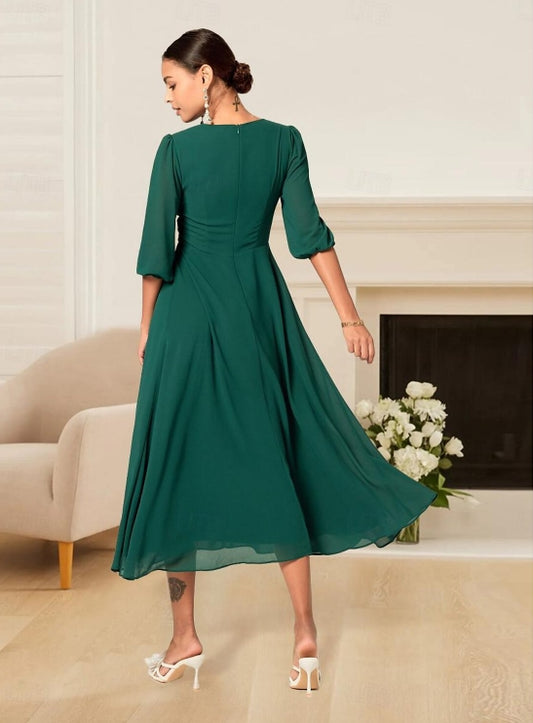A Line Dress Chiffon Ruffle Party Wedding Guest Elegant Formal V Neck 3/4 Length Sleeve Flared Sleeve