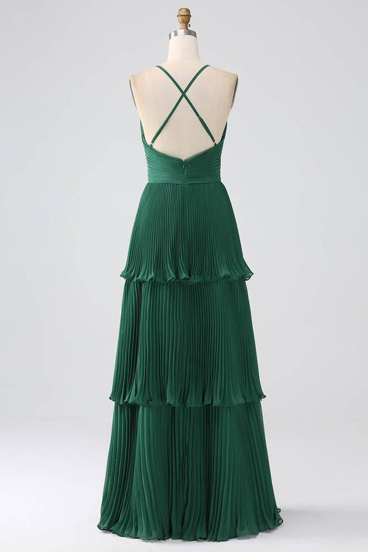 V-Neck Emerald Green Empire Pleated Floor-length Tiered Maxi Dress