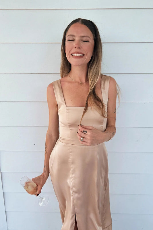 Square Neck Champagne Bridesmaid Dress With Front Slit