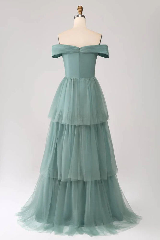 A-Line Princess Off the Shoulder Dusty Green Layered Tulle Maxi Dress