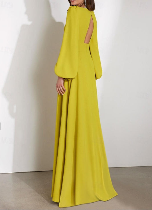 A-Line Wedding Guest Dresses Black Tie Floor Length Long Sleeve V Neck Chiffon Backless with Criss Cross