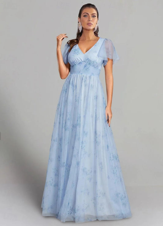 Dusty Blue V-Neck Pleated Chiffon Bridesmaid Dress Wedding Guest Party Dress