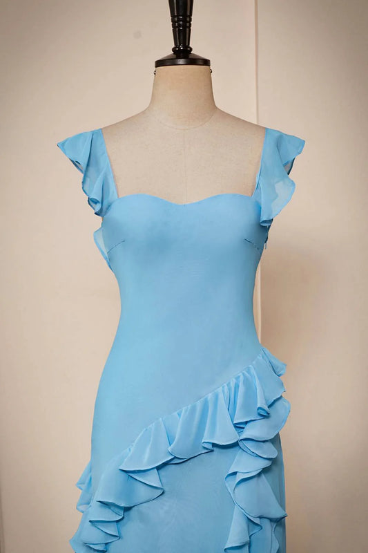 Elegant Blue Ruffle Slit Chiffon Long Bridesmaid Dress With Slit
