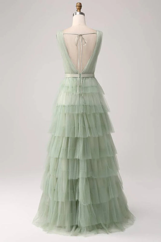 V-Neck Sage Green Tiered Floor-length A-Line Maxi Dress