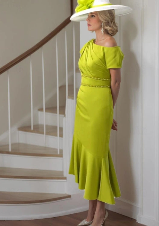 Mermaid / Trumpet Wedding Guest Dresses Tea Length Short Sleeve One Shoulder with Strappy