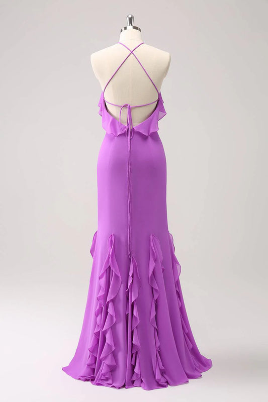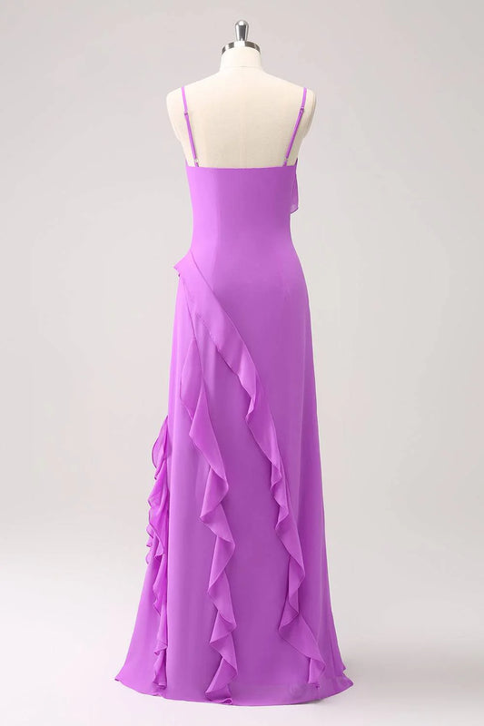 Lilac Strap Ruffle Floor-length Wedding Guest Party Dress With Slit