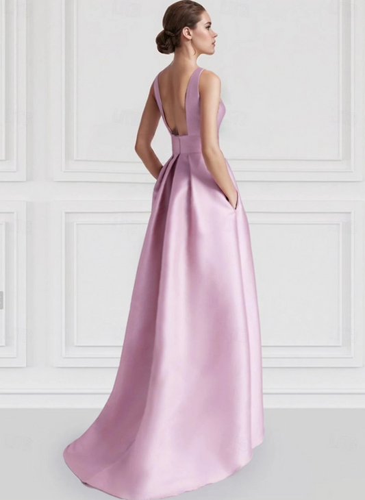A-Line Wedding Guest Dress Floor Length Sleeveless Boat Neck Pink Dress Satin with Pocket