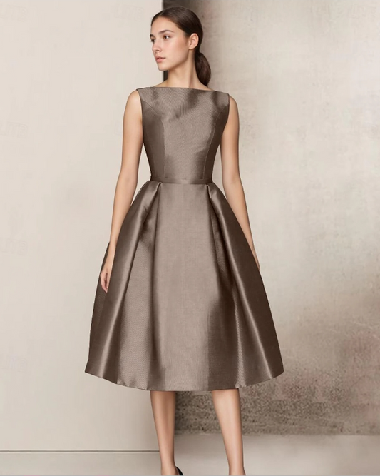 A-Line Wedding Guest Dresses Tea Length Sleeveless V Neck Pocket Satin with Bow(s)