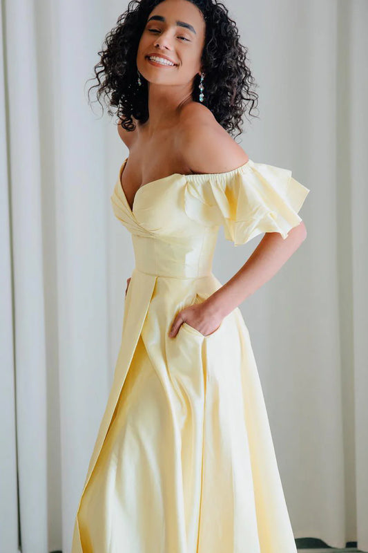 Off Shoulder Ruffles Long Yellow Wedding Guest Party Dress with Slit