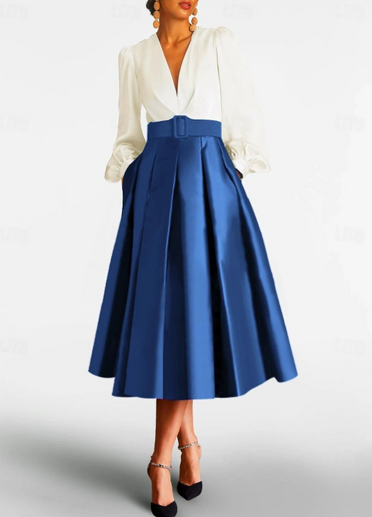 A-Line Wedding Guest Dress Tea Length Long Sleeve V Neck Satin with Ruched