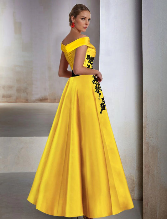 A-Line Evening Gown Wedding Guest Floor Length Sleeveless Off Shoulder Belt / Sash Satin with Slit Applique