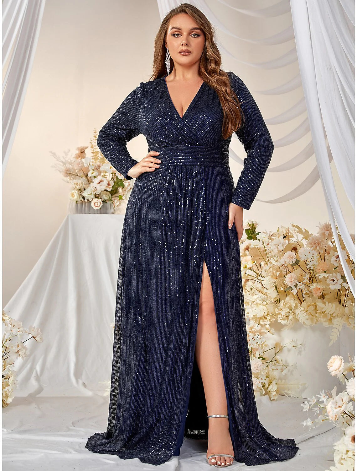 A-Line Evening Gown Plus Size Dress Formal Sweep / Brush Train Long Sleeve V Neck Polyester with Sequin Slit