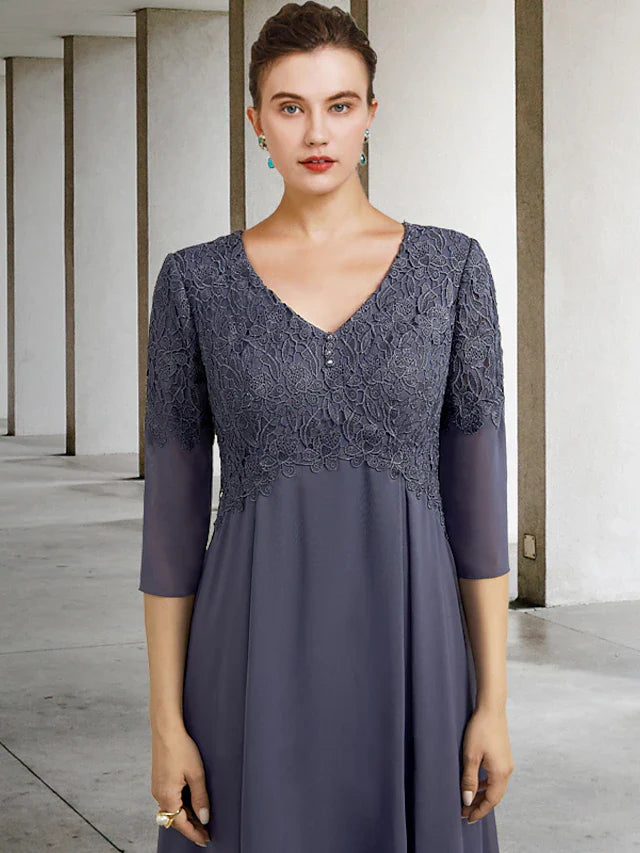 A-Line Mother of the Bride Dress Plus Size Elegant V Neck Tea Length Chiffon Lace 3/4 Length Sleeve with Ruffles Appliques