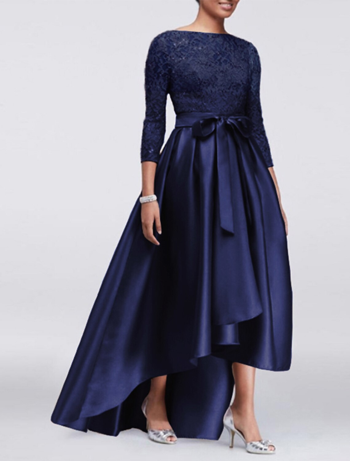A-Line Mother of the Bride Dress Plus Size High Low Asymmetrical Satin Lacewith Sash / Ribbon Appliques