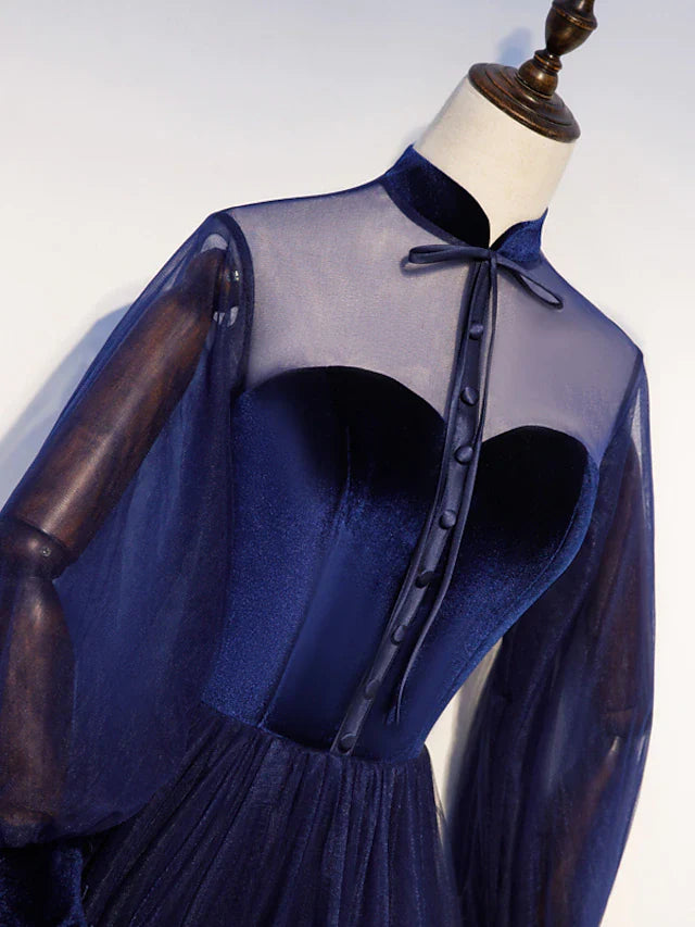 A-Line Prom Dresses Vintage Dress Party Wear Floor Length Long Sleeve Stand Collar Tulle with Bow(s) Strappy