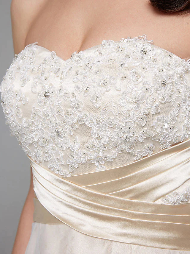A-Line Wedding Dresses Sweetheart Neckline Asymmetrical Satin Floral Lace Strapless Simple Plus Size with Bowknot Sash Ribbon Beading