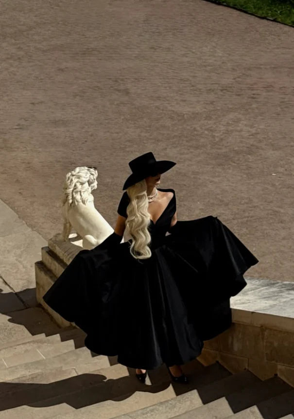 Classical A Line V Neck Cap Sleeve Satin Tea-Length Prom Dress