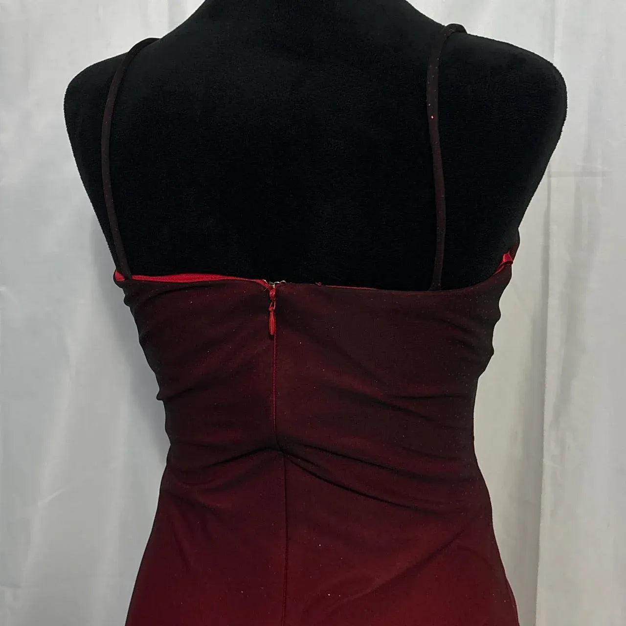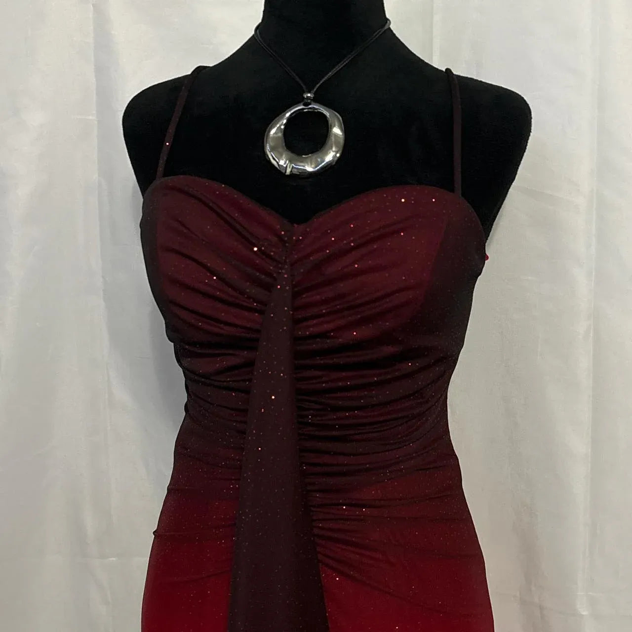 This ombré red-to-burgundy maxi dress features a strapless sweetheart neckline, a figure-hugging ruched bodice (with subtle shimmer detail), a flowing full-length skirt, and a draped sheer sash. The gradient color and lustrous fabric balance bold glamour with elegant drama, making it ideal for red-carpet events, formal galas, or upscale New Year’s Eve celebrations—combines eye-catching color with polished, showstopping charm.
